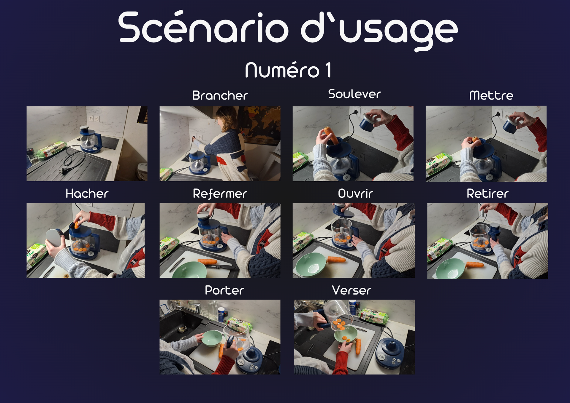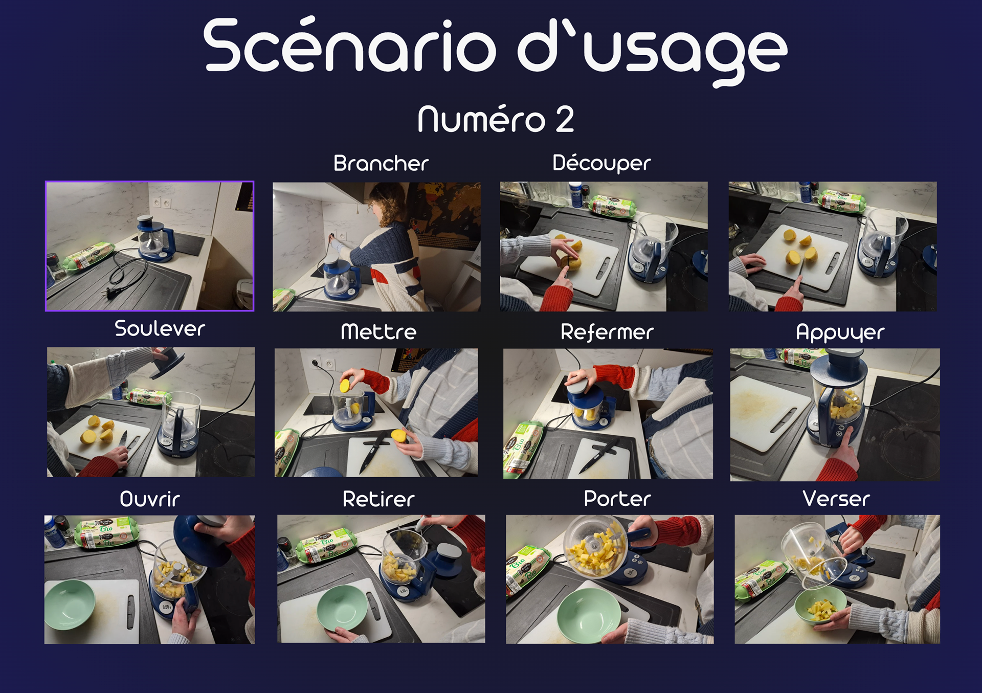 Notre produit ciblera une famille composée de deux parents et de deux enfants âgés de 8 à 14 ans, avec une mère au foyer. Après réflexion, nous avons déterminé que le produit serait utilisé le midi et le soir, lorsque la mère prépare les repas pour son mari et leurs deux enfants. Notre objectif est de comprendre les besoins, les attentes et les comportements de cette famille afin de concevoir un produit véritablement adapté. Le produit devra donc être facile à utiliser (instinctif), mais aussi simple à nettoyer, notamment en étant compatible avec le lave-vaisselle.